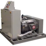 A brushless motor and generator are mounted side-by-side (vertical one atop another to minimize footprint is an option) on a welded steel frame skid. This design (as opposed to solid state full sine wave design) is recommended because: